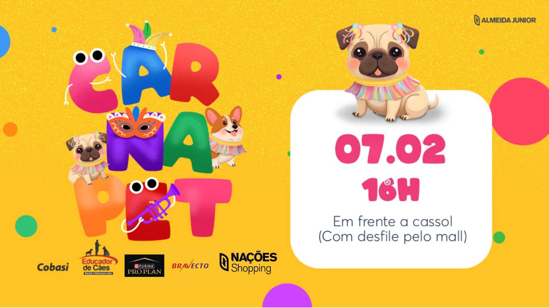 O Carnapet é um evento voltado para todos os pets e acontecerá no dia 07 de fevereiro, às 16h, em frente à Cassol, no Nações Shopping.